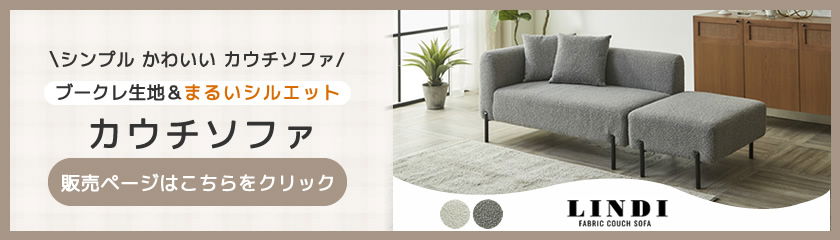 | 商品説明 | 当社オリジナルのファブリックカウチソファ リンディ (LINDI) シンプルかわいい丸みを帯びたフォルムの1Pソファとスツールを組み合わせたファブリックカウチソファ。ふんわり&モコモコとした優しい質感のブ ー クレ生地を使用。その心地よい肌触りとやわらかな風合いが、空間にさりげない上質感を添えます。スツールは位置を変えてオットマンとして使用したり、レイアウトを変えることができます。くつろぎの時間を快適に。ミニ脚付属でロータイプ・フロアソファとしても使用が可能です。ソファとお揃いの生地を使用したクッションも2個付属。背もたれ、枕としても使えます。 |