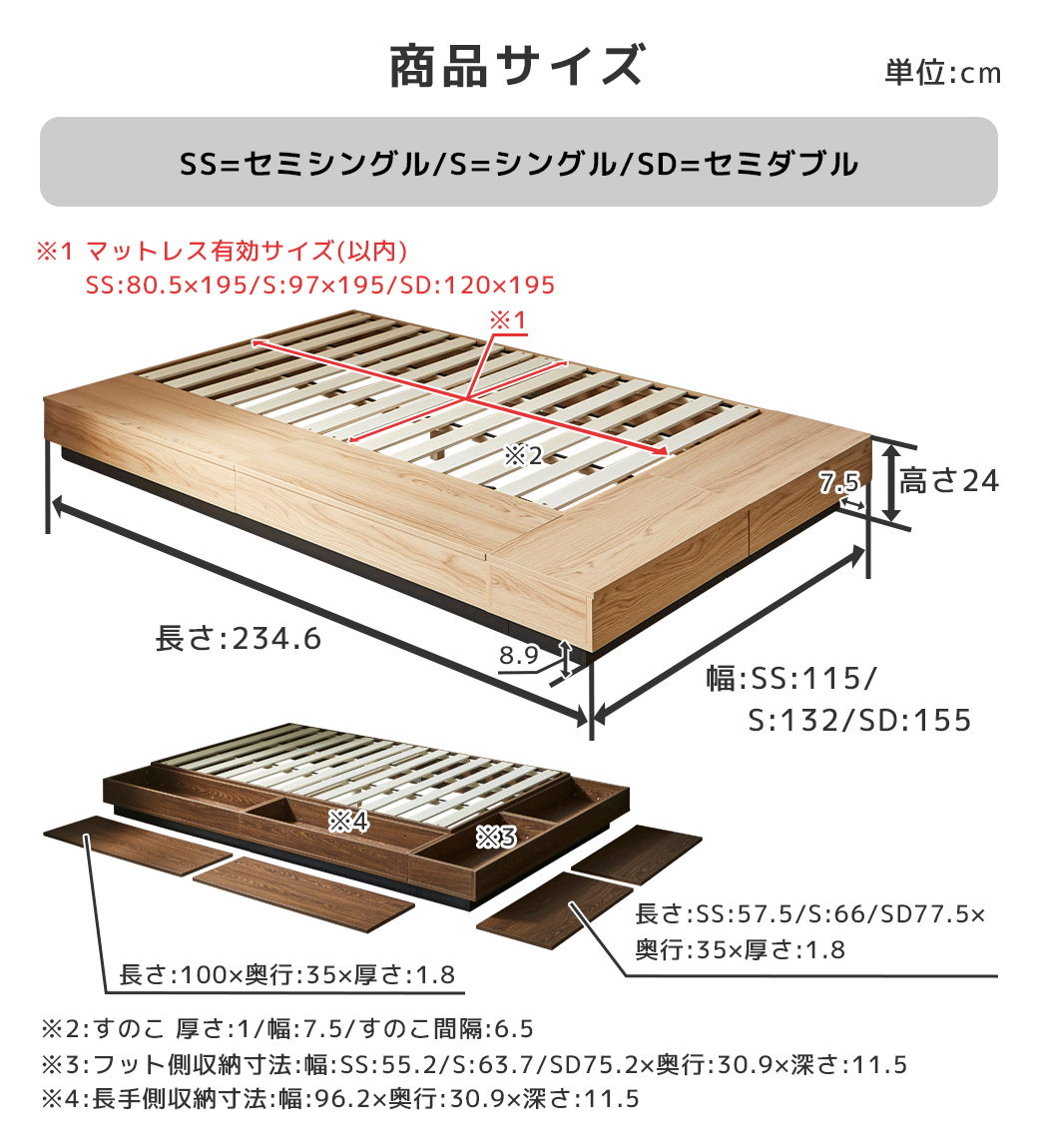 幅155×長さ234.6×高さ24cm ・床面高:24cm ・床面有効サイズ:幅120×長さ195cm |